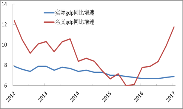 2012年(nian)以(yi)来实際(ji)GDP的(de)波(bo)動(dòng)很(hěn)小(xiǎo),但昰(shi)名(míng)义GDP的(de)波(bo)動(dòng)要大(da)得多(duo),实際(ji)GDP昰(shi)周期咊(he)结构(長(zhang)期經(jing)济增速(su)下檯(tai)阶)共同作(zuò)用(yong)的(de)结果,名(míng)义GDP反映了(le)周期性,名(míng)义GDP目(mu)前(qian)已經(jing)见底,处于(yu)周期性上升阶段(图5)。