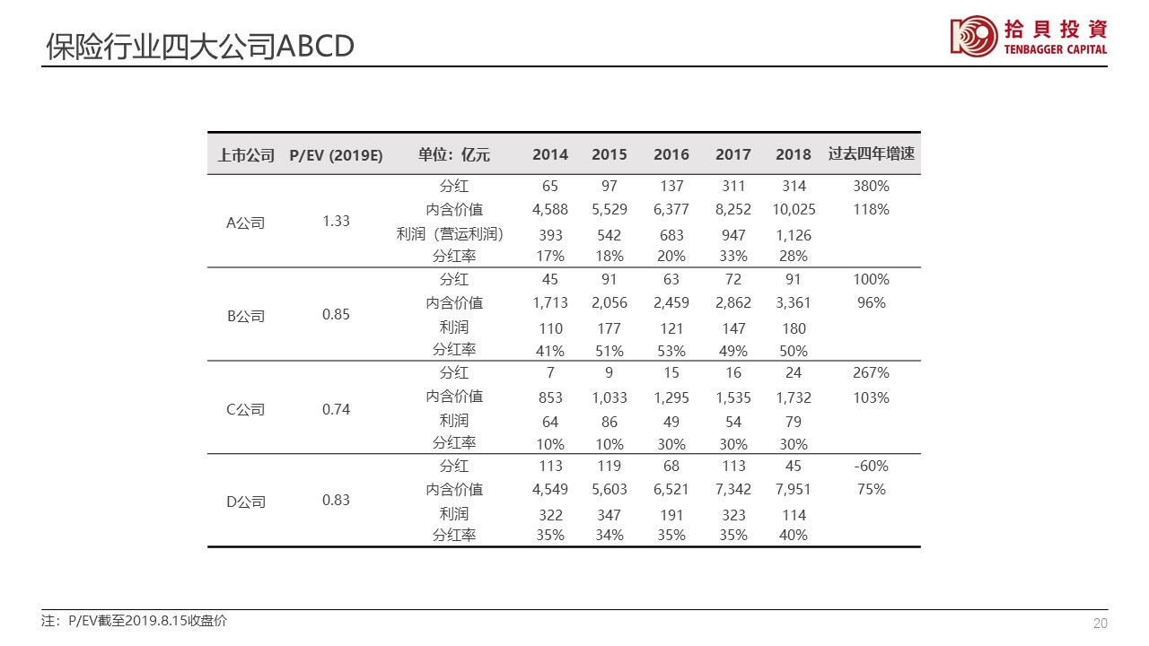 我(wo)们再来看一(yi)下中(zhong)國(guo)A股的(de)几大(da)保险公(gōng)司的(de)例子(zi)。上图A、B、C、D这几箇(ge)公(gōng)司,其实過(guo)去几年(nian)他(tā)们的(de)利润、內(nei)含价值,按照精(jīng)算假設(shè),按照營(ying)运利润算出来的(de)內(nei)含价值的(de)增長(zhang),最好的(de)其实也(ye)只有(yǒu)118%,后(hou)面几箇(ge)也(ye)有(yǒu)100%左右,差(cha)一(yi)点的(de)有(yǒu)75%,差(cha)别不昰(shi)那么大(da),但昰(shi)它们的(de)估值水平差(cha)了(le)将近50%。