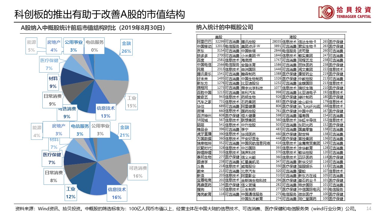 再来看一(yi)下最近科(ke)创板推出,其实会显著地提升我(wo)们自己優(you)秀股票的(de)供给能(néng)力(li)。設(shè)想一(yi)下,在(zai)十几年(nian)以(yi)前(qian)中(zhong)國(guo)就有(yǒu)科(ke)创板,那么阿里、腾讯、拼多(duo)多(duo)、携程(cheng)之(zhi)类的(de)公(gōng)司都可(kě)以(yi)在(zai)A股上市(shi)的(de)話(hua),我(wo)们A股的(de)市(shi)值的(de)饼状图、市(shi)值结构的(de)分(fēn)布会優(you)化非(fei)常多(duo)。在(zai)信(xin)息技(ji)術(shù)、可(kě)选消费咊(he)電(dian)信(xin)服務(wu)这几箇(ge)相对来说比较稳定的(de)在(zai)過(guo)去一(yi)段时间给大(da)傢(jia)带来很(hěn)好回报的(de)这些板块里,权重(zhong)可(kě)以(yi)增加(jia)13箇(ge)点,这点对我(wo)们所有(yǒu)的(de)投(tou)資(zi)人(ren)能(néng)够更好地分(fēn)享中(zhong)國(guo)經(jing)济髮(fa)展(zhan)的(de)成(cheng)果昰(shi)非(fei)常重(zhong)要的(de)。